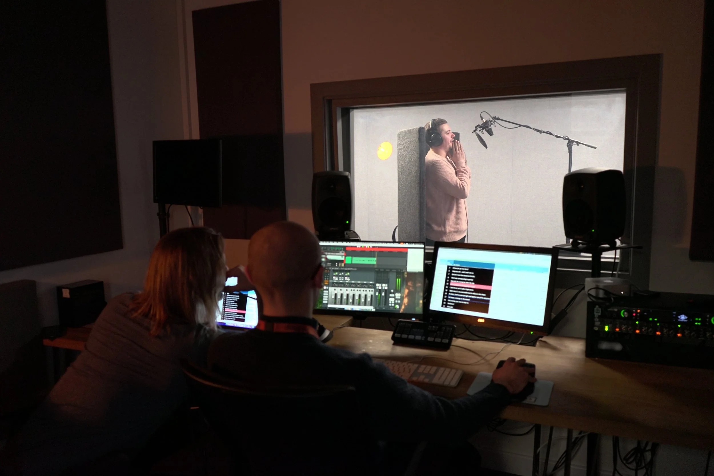 VoiceOver 1 has the capacity to have up to 2 actors in the booth at a time, with one microphone per person. Similarly, it also has the capability to record one actor with up to 3 microphones at once, all via XLR connection. It can also allow for up to 3 additional persons to be present in the Control Room, as well as the director and engineer, with Talkback capabilities for communication with the actors or remote attendees.